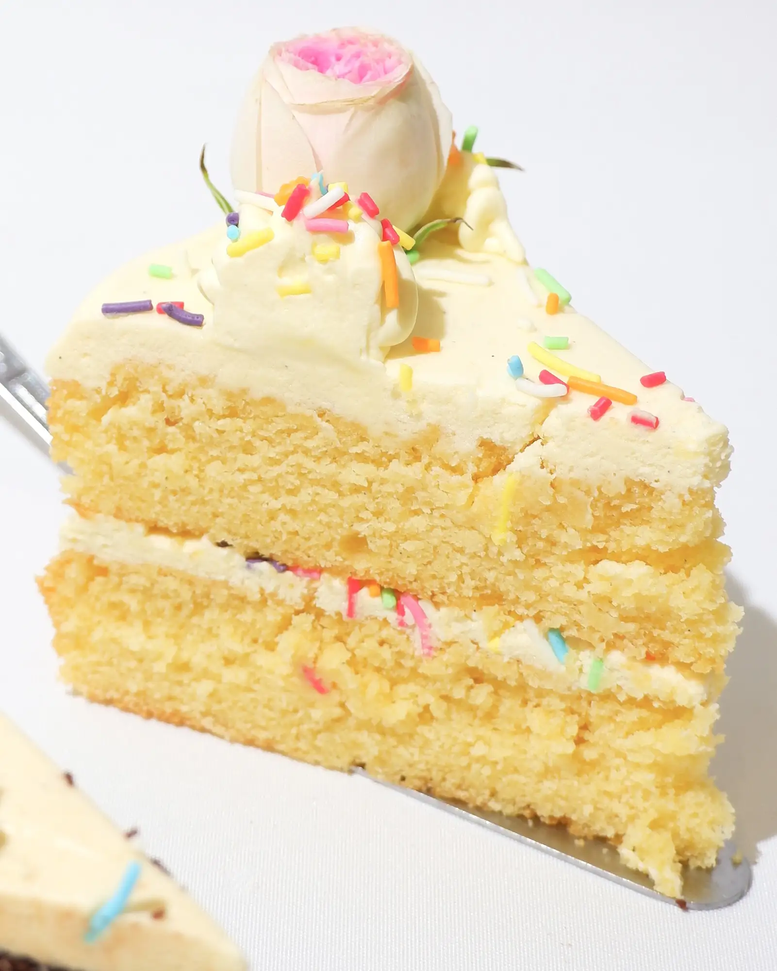 Uncomplicated, yet deeply delicious. Two layers of impossibly soft vanilla cake, containing 3 types of vanilla, with triple vanilla bean cream cheese icing between the layers.