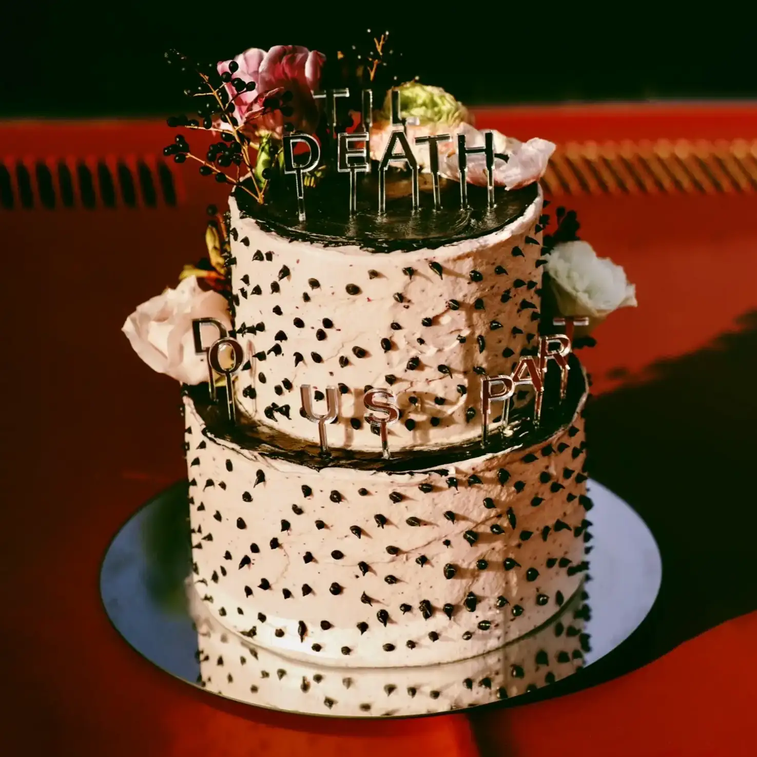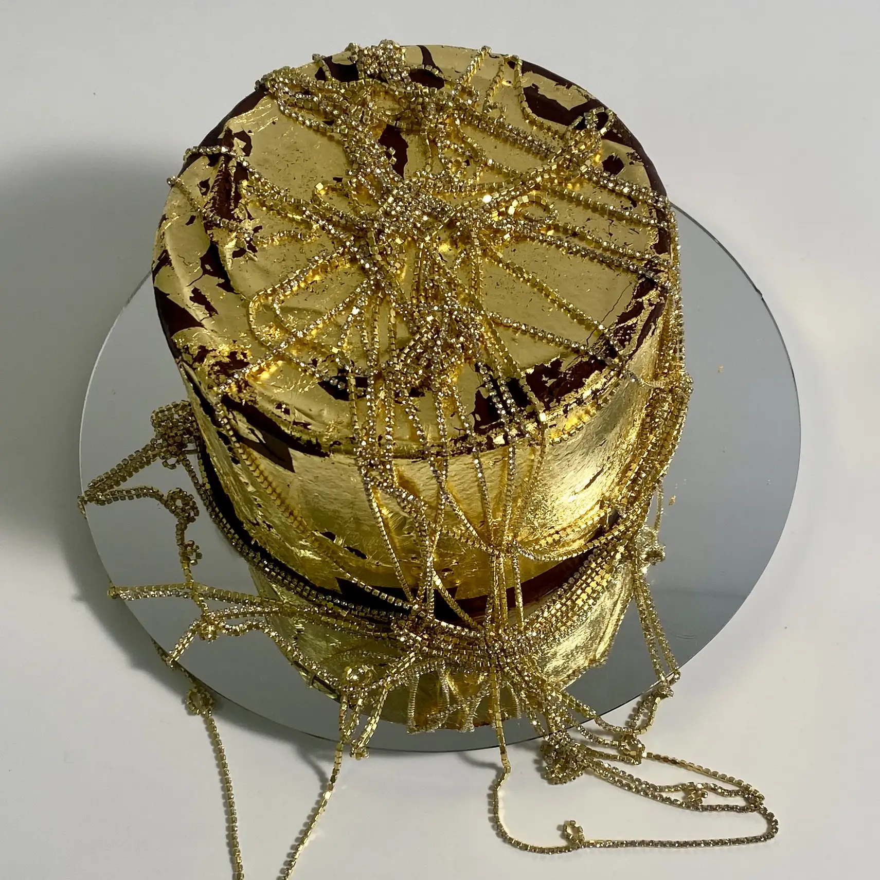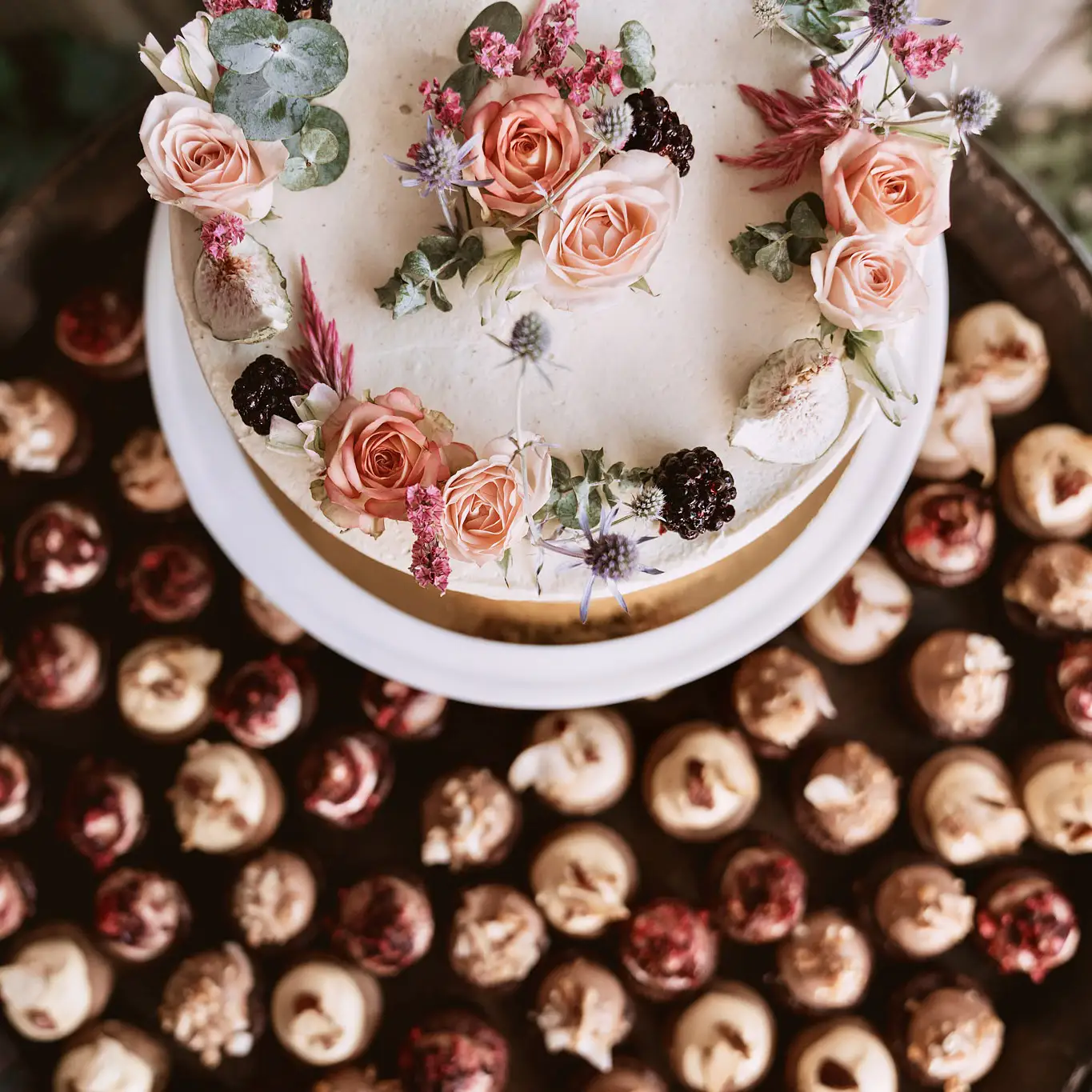 For color accents I use fresh flowers, freeze-dried fruits and powders and other elements like crushed nuts, coulis, curds or caramel. I do not use food coloring or fondant. I can work towards your brief for florals and I can write short messages on cakes using very chic mirror letter toppers. A unique decoration element I offer is to drape (non-edible) crystal chains over the cake or add metal studs. Please see the gallery below or instagram for inspiration!